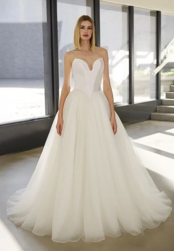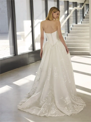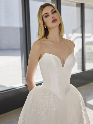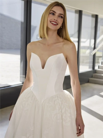 Udělejte velkolepý vstup do svého velkého dne s úžasným designem princeznovských svatebních šatů DALYA. Tento hladký model se skládá z korzetového živůtku bez ramínek perfektně tvarovaného z mikada s detailem do V v pase, ze kterého vychází nezapomenutelná objemná nafouknutá sukně z lehoučké organzy. Tento trendy střih evokuje moderní a stylovou verzi Disney princezen. Spodnička dodává sukni tvar i objem a vytváří velkolepý vzhled.