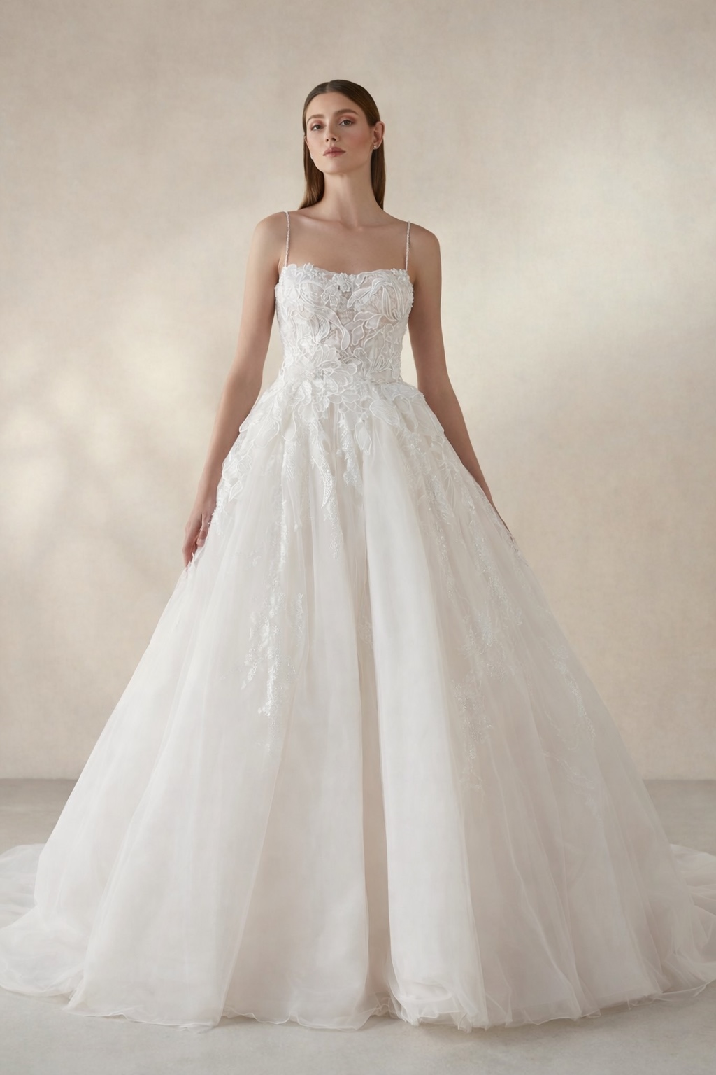 Model DAYLILY je romantická svatební róba s jemnými ramínky, korzetem z transparentního tylu bohatě zdobeným 3D květinovou krajkou a perličkami. Bohatá tylová sukně s decentním leskem plynule přechází v majestátní vlečku. Výrazným detailem je odnímatelná květinová brož v pase, která dodává modelu jedinečný šarm a možnost osobité úpravy.
