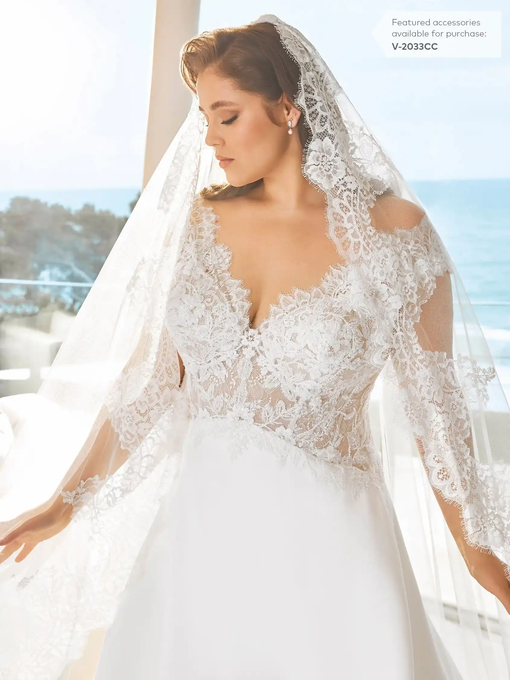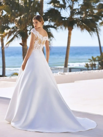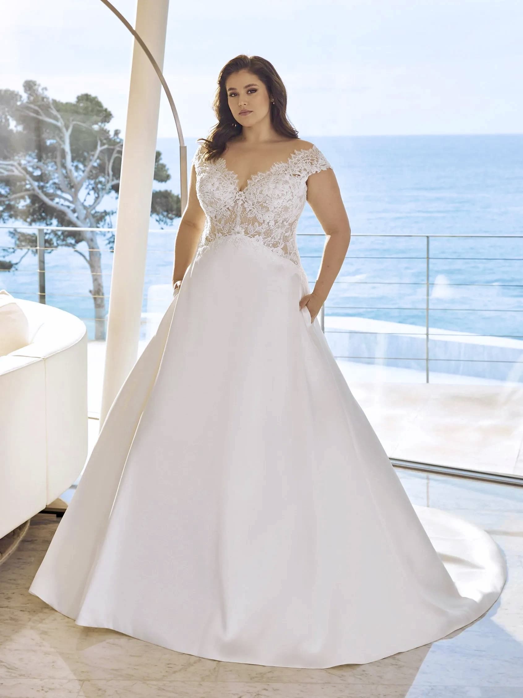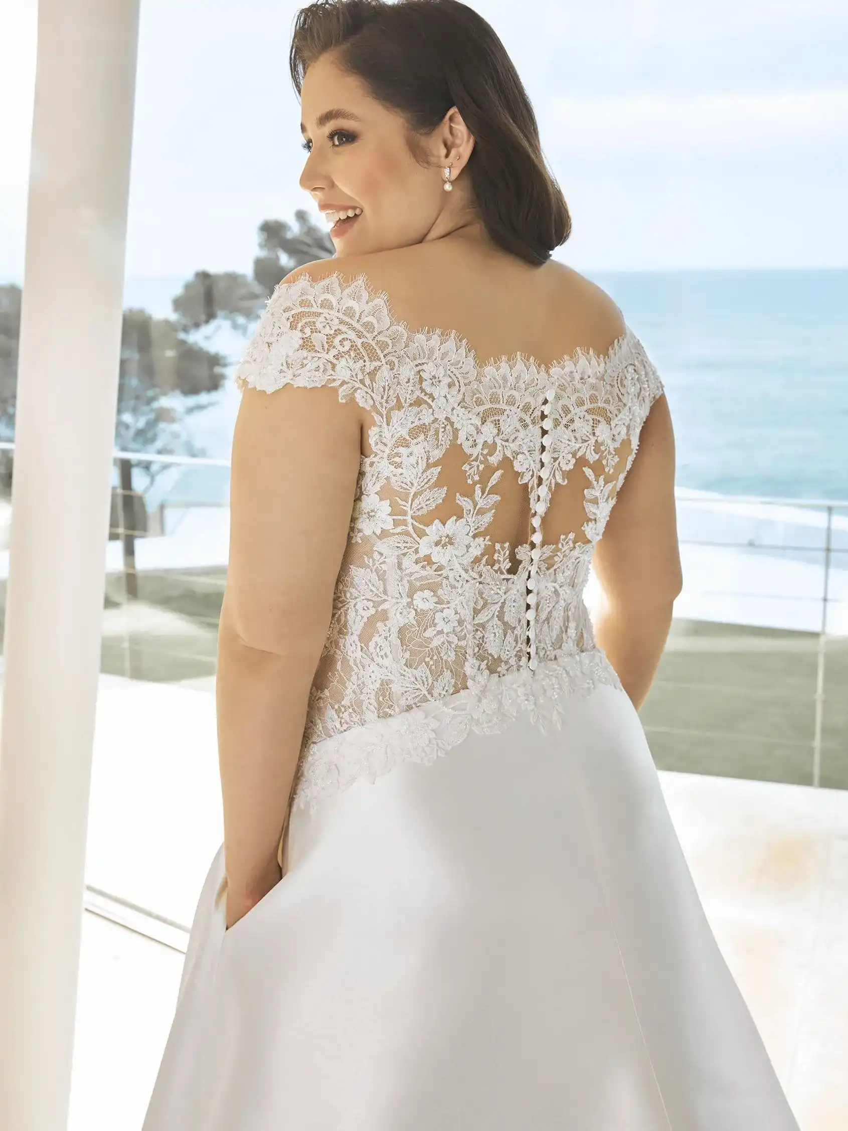 Bohatě zdobený živůtek z jemné krajky s hlubším výstřihem vytváří sofistikovaný kontrast k čisté, hladké sukni z mikada, která krásně splývá a působí nadčasově. Celek vyzařuje noblesu, ženskost a sebevědomý couture charakter – ideální volba pro nevěstu, která hledá výrazný, ale dokonale vyvážený model s důrazem na precizní střih a luxusní zpracování.