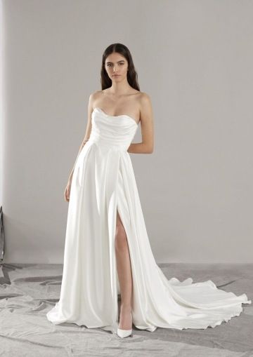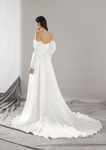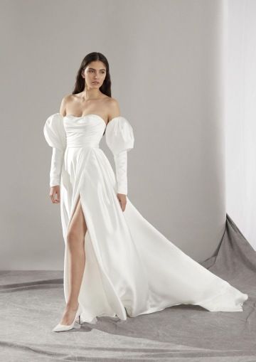 Zamilujte se do Pronovias ELLISON - minimalistického modelu áčkového střihu s výstřihem bez ramínek z luxusního, hedvábně hebkého šarmé. Vyztužený korzet se smyslným řasením skvěle sedí i na malá prsa. Šaty mají otevřená záda. Lehká sukně s kapsami má dynamický přední rozparek. Komplet je doplněn odnímatelnými nafouklými rukávy.