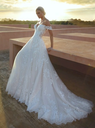 V těchto klasických princeznovských šatech ELYSEES v áčkovém střihu s odhalenými rameny, nenuceným půvabem a romantickou květinovou krajkovou aplikací po celé délce rozhodně zazáříte. Poloiluzivní živůtek se vyznačuje výstřihem ve tvaru srdce, něžnými spadenými ramínky a sochařským švem na knoflících v dolní části zad, který svůdně přechází do vrstveného tylové zdobené vlečky. Transparentní panely na bocích vyštíhlí pas a zdůrazní siluetu přesýpacích hodin. Nádherné na jakémkoliv typu postavy.
