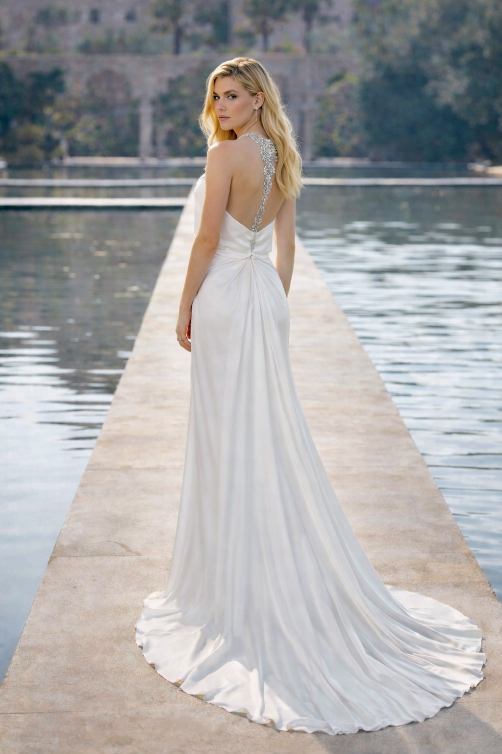 Výrazným prvkem jsou otevřená záda s jemně zdobeným průkrčníkem, která vytvářejí elegantní kontrast k splývavé přední části. ESQUIRE jsou ideální volbou pro nevěstu, která hledá nenucenou noblesu, pohodlí a vytříbený styl.