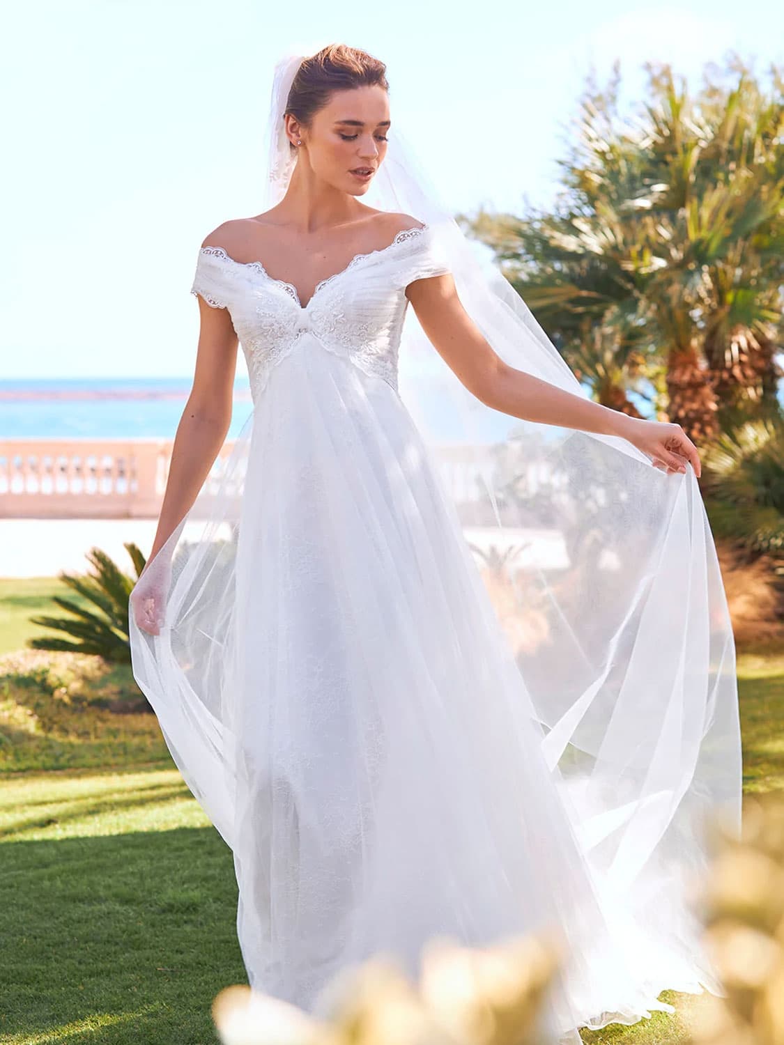 Svatební šaty ETAIN zaujmou jemnou éterickou estetikou a lehkostí, která je jako stvořená pro romantickou svatbu u moře i v zahradě. Empírový střih s lehce zvýšeným pasem krásně prodlužuje siluetu, zatímco měkká tylová sukně splývá s naprostou přirozeností a lehkostí.