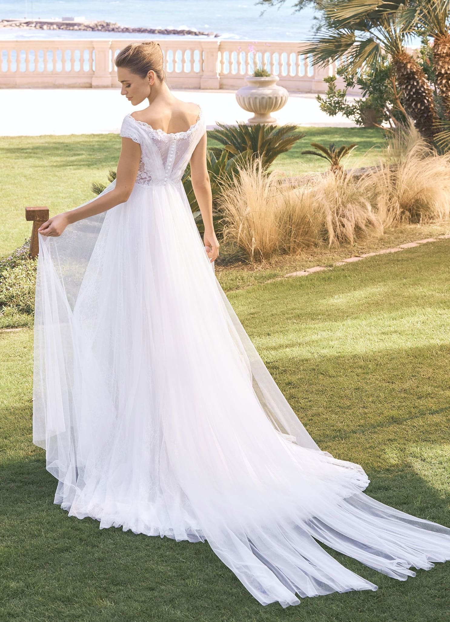 Výrazným prvkem je výstřih typu Bardot doplněný romantickými, jemně řasenými ramínky. Krajkový živůtek s decentním zdobením plynule přechází do vzdušné áčkové sukně s decentní vlečkou, která dodává modelu něžný, nadčasový charakter.