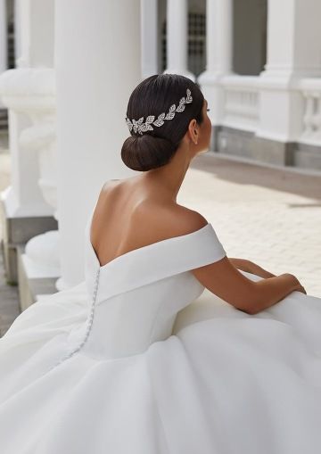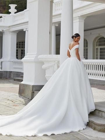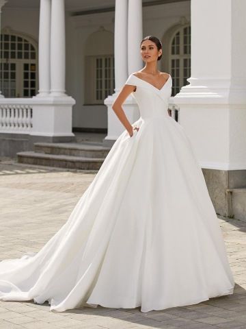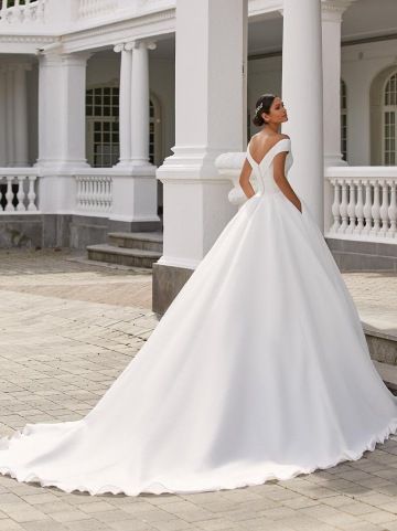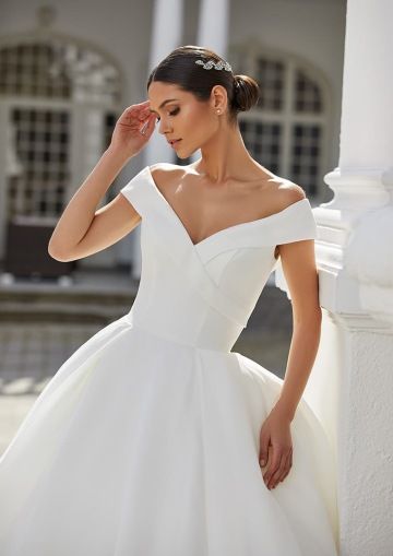 Princeznovská silueta má strukturovaný živůtek s decentním výstřihem a elegantními spadenými ramínky s klopou. Široké sklady na sukni a prostřižení v pase lichotí postavě. Lem sukně a dlouhé vlečky při pohybu vzdušně pluje a působí velmi něžně a žensky.