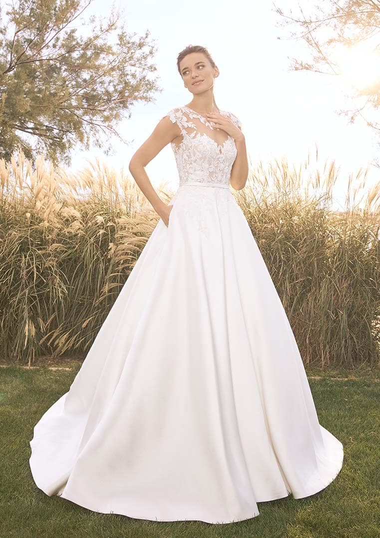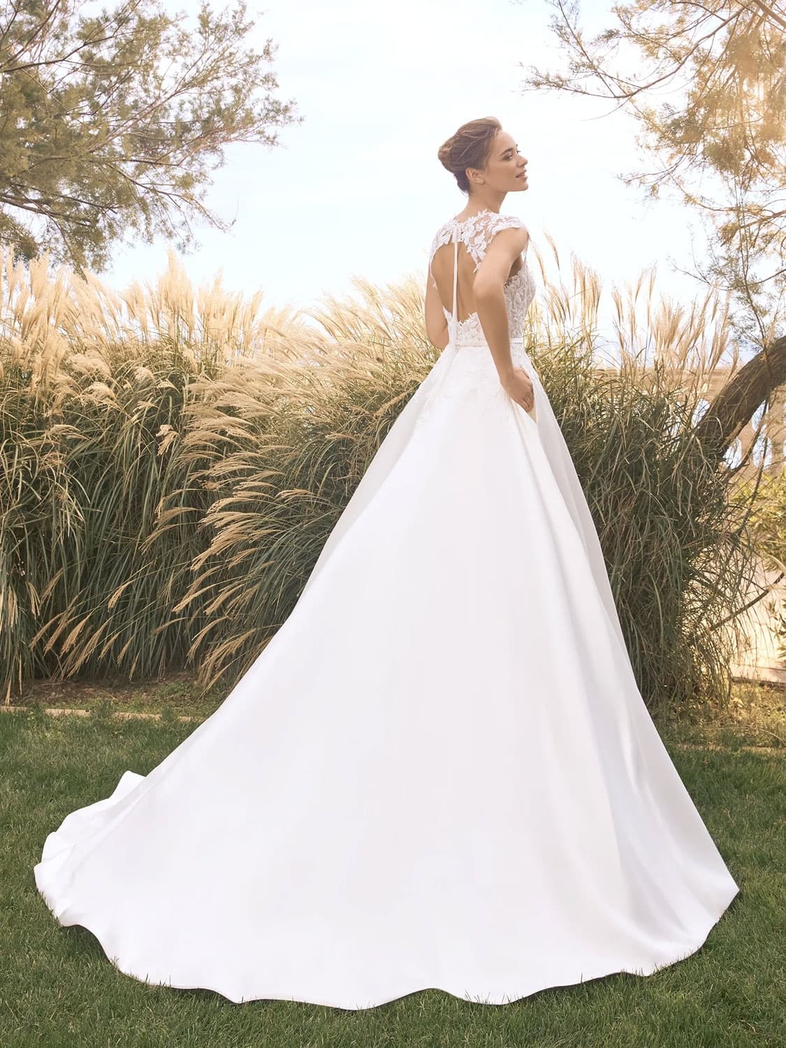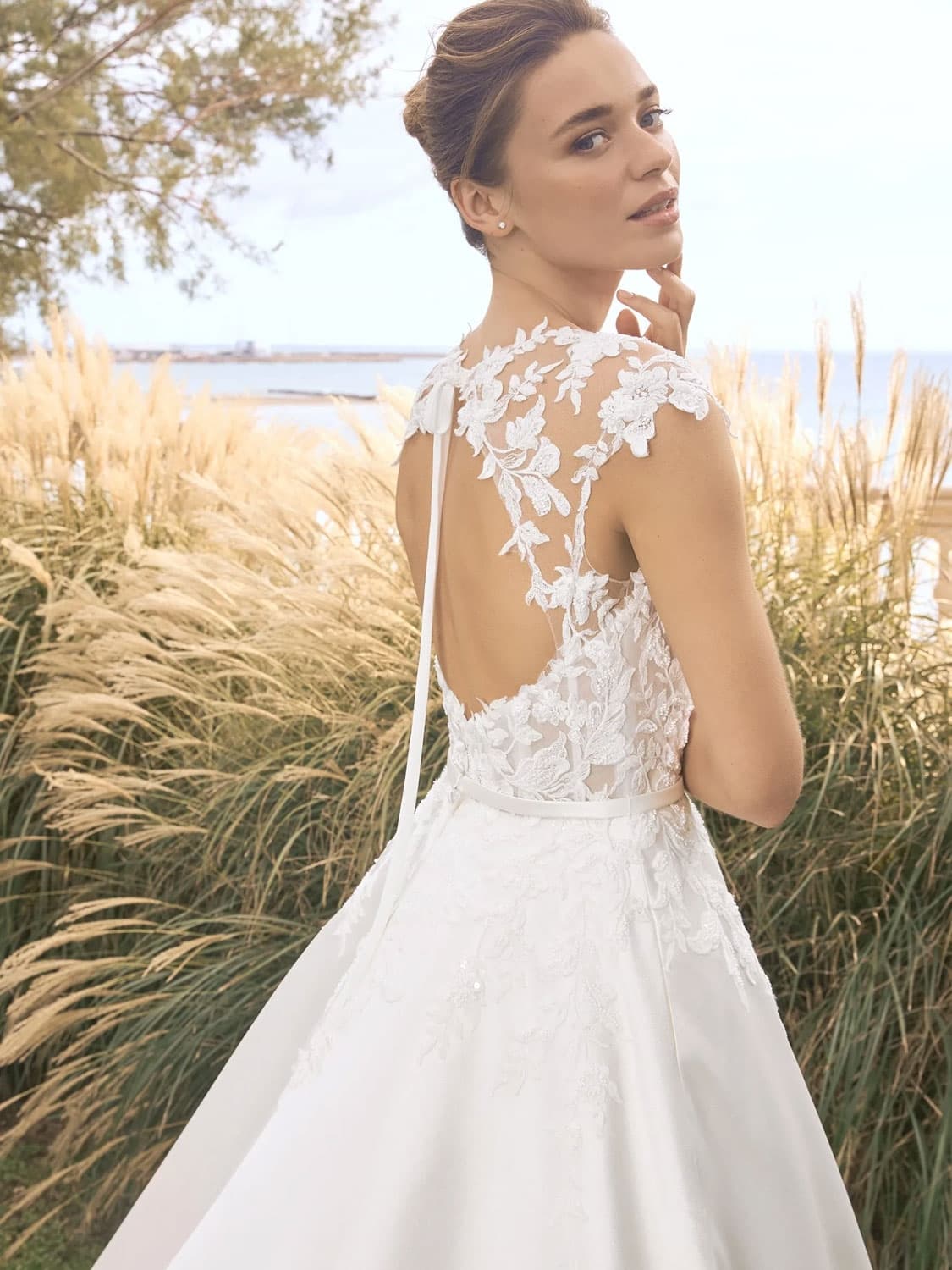 Zadní část je jedním z nejsilnějších prvků tohoto modelu – otevřená záda jsou rámována jemnou krajkou a doplněna úzkou stužkou, která působí něžně a velmi ženským dojmem. Hladká áčková sukně z mikada se při chůzi přirozeně vlní a vytváří elegantní siluetu, která lichotí různým typům postav. FIANNA je ideální volbou pro nevěstu, která hledá romantické šaty s čistou linií, ale zároveň touží po detailu, který ji odliší.