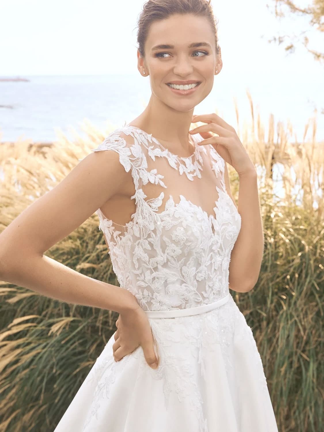 Šaty FIANNA působí lehce a přirozeně, přesto jsou plné detailů, které si zamilujete až při bližším pohledu. Živůtek z jemného tylu je bohatě zdoben krajkovými aplikacemi s florálními motivy, které plynule přecházejí z linie výstřihu směrem do pasu. Transparentní dekolt a ramínka vytvářejí efekt „druhé kůže“ a dodávají šatům vzdušnost, zatímco precizně tvarovaný střih krásně zvýrazňuje horní část postavy bez pocitu těžkosti.
