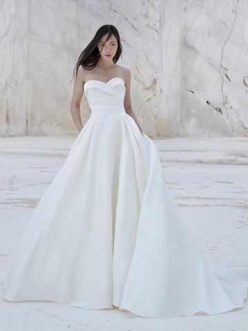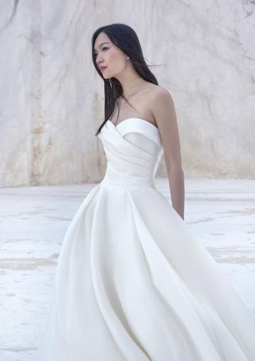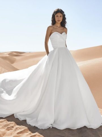 Šaty v princeznovském stylu pro moderní nevěstu Pronovias GEIRANGER. Vyrobeny z jemné a lehké organzy s precizně nařaseným živůtkem ve tvaru srdce a hlubokými kapsami uvnitř širokých záhybů vzdušné sukně s ohromující vlečkou. Spodnička dodává sukni tvar i objem a vytváří velkolepý vzhled.