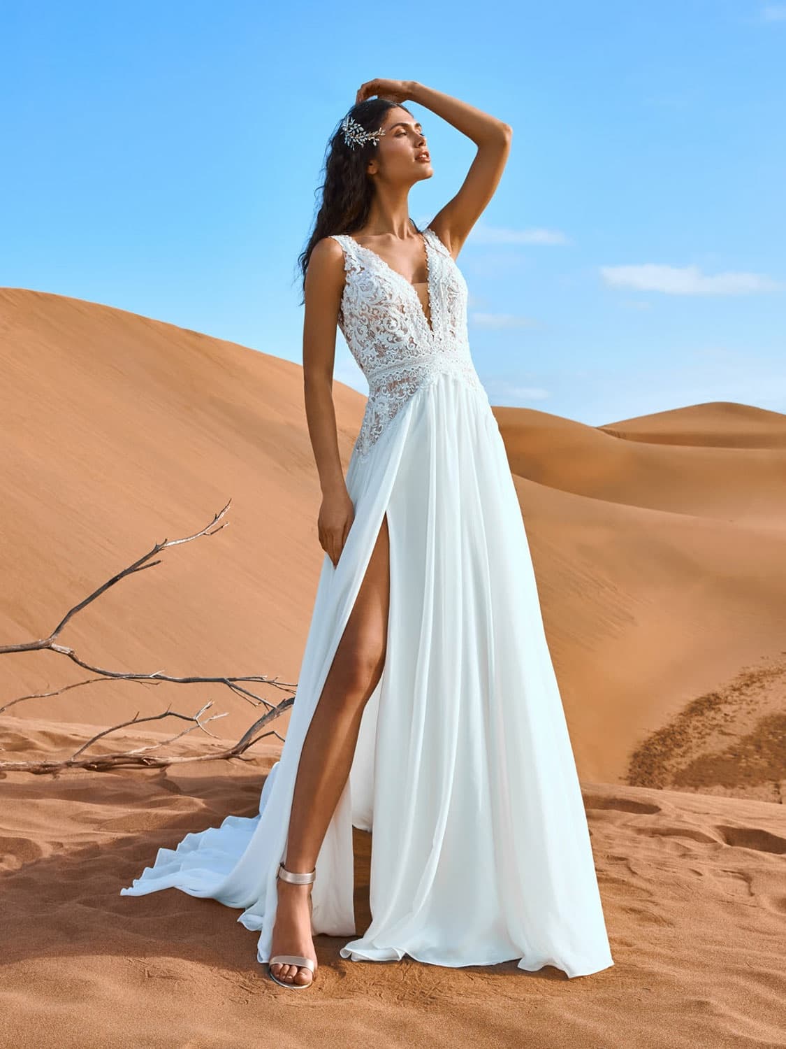 Svatební šaty HALONG zaujmou lehkým boho charakterem a smyslnými detaily. Krajkový živůtek s originálními sníženými boky a hlubokým výstřihem do V opticky prodlužuje siluetu a krásně tvaruje dekolt, zatímco jemná šifonová sukně s vysokým rozparkem dodává modelu vzdušnost a přirozený pohyb.