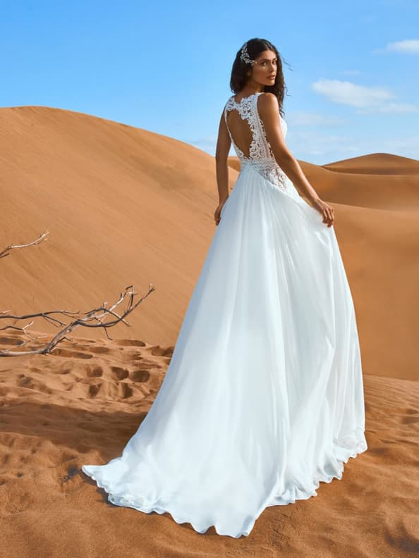 Zadní část šatů je zdobená výraznou krajkou s transparentními partiemi, které působí velmi žensky a lehce odhaleně. HALONG jsou ideální volbou pro nevěsty hledající rovnováhu mezi elegancí, lehkostí a moderní svatební estetikou – perfektní pro svatbu v přírodě, na pláži i v netradičním prostředí.