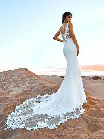 Luxusní a elegantní svatební šaty Pronovias HARBOUR v minimalistickém stylu s úzkou sukní a hladkým předním dílem s decentním výstřihem do V vhodným i pro větší prsa. Netradiční prvek zadního krajkového dílu s 3D efektem a nádherně zdobenou vlečkou. Krajkové průstřihy na bocích zdůrazňují pas a vytvářejí efekt přesýpacích hodin.