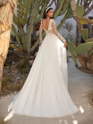 Boho svatební šaty Pronovias HEDREN se splývavou šifonovou sukní s rozparky. Nádherně vyšívaný transparentní živůtek s výstřihem do V vepředu i vzadu a s dlouhými rukávy zdobený proužky jemné boho krajky.
