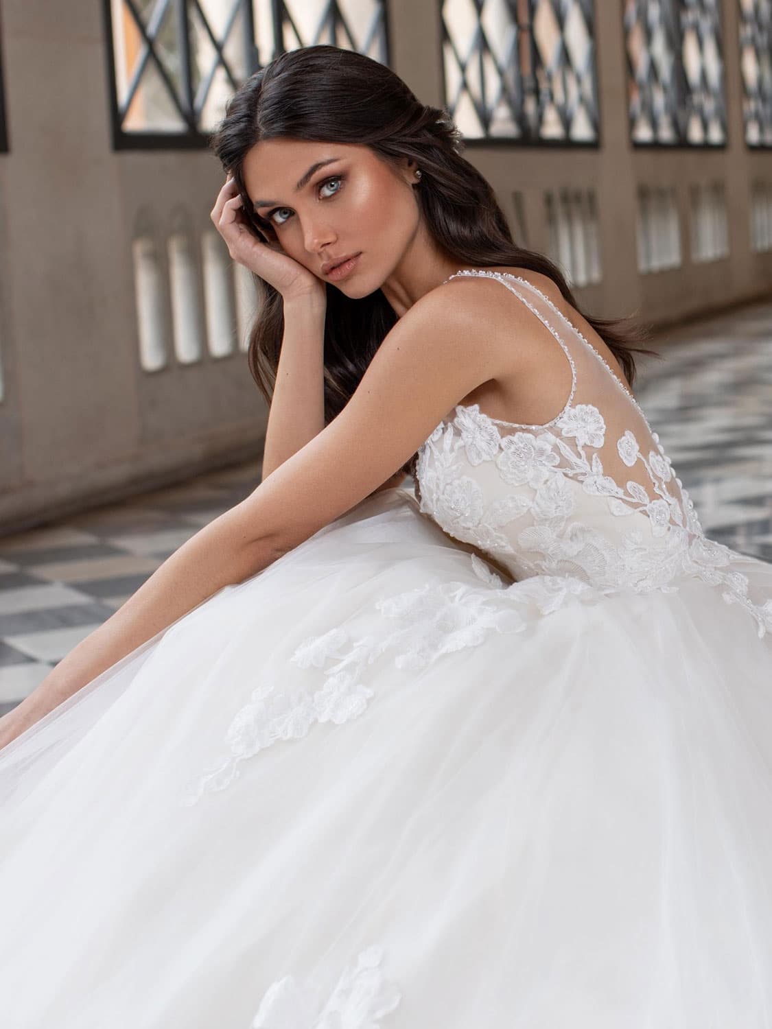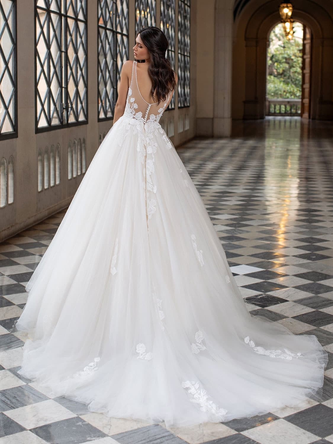 Objemná tylová sukně má několik vrstev, díky nimž drží tvar, ale nepůsobí těžce. Zadní díl překvapí otevřenými zády s transparentním tylem a jemným zapínáním, které prodlužuje siluetu a dodává šatům lehce smyslný akcent. HOLM jsou ideální volbou pro nevěstu, která chce klasický princeznovský objem, ale v moderním a velmi ženském pojetí, s důrazem na detail a lehkost.