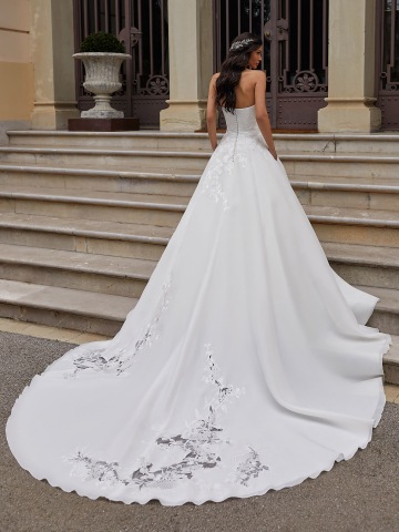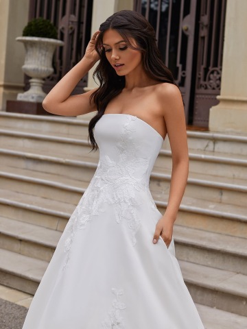 Svatební šaty INGRAM jsou ztělesněním čisté elegance a nadčasového luxusu. Minimalistický korzet bez ramínek s precizně tvarovanou linií krásně zvýrazňuje dekolt i pas. Jemné krajkové aplikace nejsou na látku pouze našité – jsou citlivě vyřezávané přímo do organzy, díky čemuž působí lehce, přirozeně a dokonale splývají se siluetou šatů.