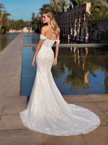 Okouzlující a sofistikovaný model Pronovias KENAI nabízí klasickou siluetu s opulentními moderními aplikacemi s rostlinnými motivy. Tyto korzetové svatební šaty ve střihu mořské panny s odepínacími spadenými ramínky jsou zdobeny vrstvenou španělskou krajkou, flitry a korálky.