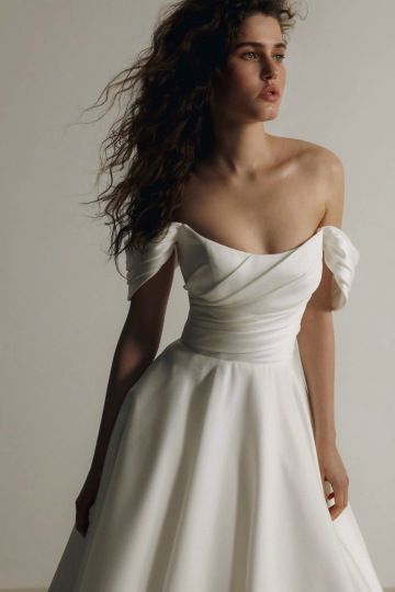 Ohromující model princeznovského střihu, který evokuje nejmodernější minimalismus. Pronovias KEONI z luxusního mikada s módním výstřihem ve tvaru lžičky, který zvýrazňuje dekolt, a staženým pasem. Vyztužený korzet s lichotivými záhyby, které sahají až k sukni s kapsami a širokou vlečkou. Šaty mají otevřená záda.