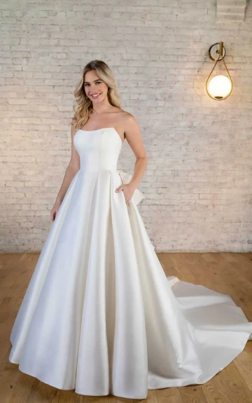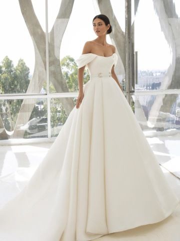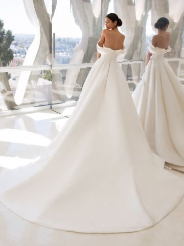 Tyto princeznovské minimalistické svatební šaty Pronovias LYNN z luxusního mikada připomínají zlatý věk vintage couture s módním výstřihem ve tvaru lžičky, který zvýrazňuje dekolt, a staženým pasem. Na obřad je zkombinujte s dramatickými spadenými ramínky a na začátku večírku odhalte ramena.