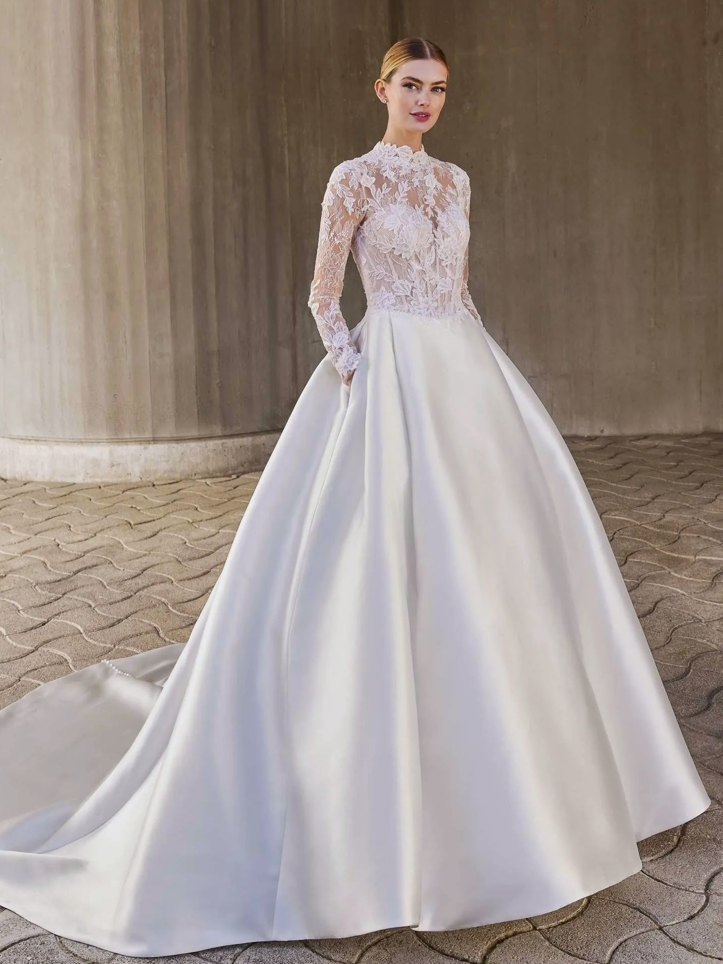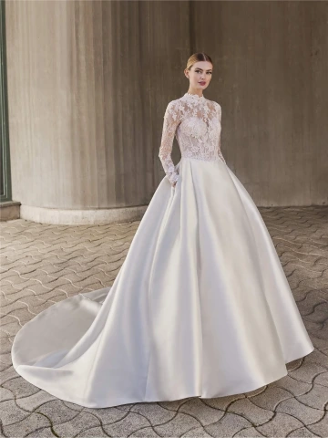 MAPLIS je dechberoucí princeznovský model, který kombinuje bohatou mikado sukni s jemnou krajkou. Luxusní vyztužený korzet s dlouhými rukávy působí jako krajkový šperk přímo na těle – výstřih ke krku a průsvitné detaily dodávají šatům královský půvab. Zadní část zaujme odhaleným oválným výstřihem a dlouhou řadou potahovaných knoflíčků. V těchto šatech se budete cítit jako skutečná aristokratka – sebevědomě, elegantně a nezapomenutelně.