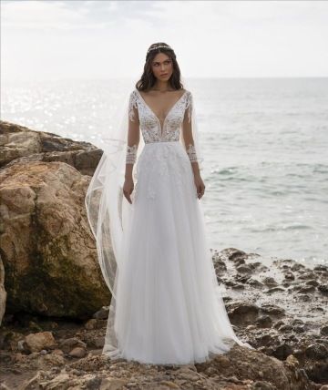 Boho svatební šaty Pronovias MILLER se splývavou tylovou sukní s krajkovými aplikacemi do ztracena. Velmi slušivá áčková sukně, která jemně splývá přes boky. Transparentní živůtek nádherně vyšívaný bavlněnou boho krajkou, s výstřihem do prohloubeného V a s tříčtvrtečními rukávy.