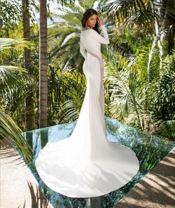 Hladké svatební šaty Pronovias MORGAN z mírně elastického krepu s dlouhým rukávem. Nádherně vyšívaný průsvitný pruh, který se line jako třpytivá řeka od levého podpaží přes pravý bok až k zemi.