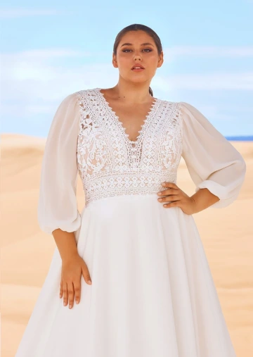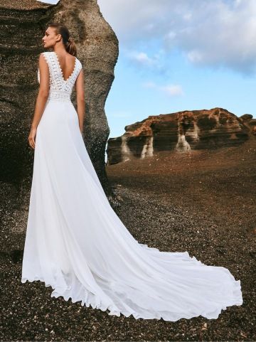 Splývavé boho šaty Pronovias MURDO s rozevlátou šifonovou sukní. Vyztužený živůtek s nude podšívkou zdobený pravou bavlněnou macramé krajkou. Praktická široká ramínka s výstřihem do V vepředu i vzadu. Vzdušný, jemný model v rustikálním boho chic stylu vhodný i pro větší velikosti.