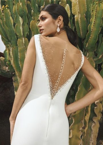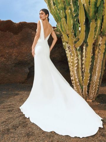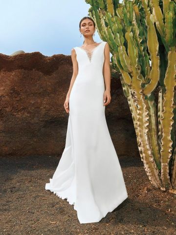Hladké svatební šaty Pronovias PARIA z mírně elastického krepu v trendovém minimalistickém stylu. Praktický rozvolněný střih sukně zdůrazní ženskou siluetu, ale zároveň poskytne pohodlí a volnost pohybu. Nádherně vyšívaný výstřih ve tvaru V vepředu i vzadu dodá tomuto jednoduchému stylu trochu luxusního třpytu.