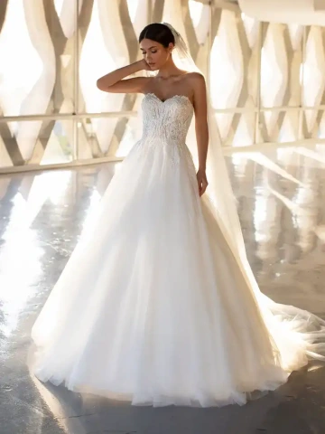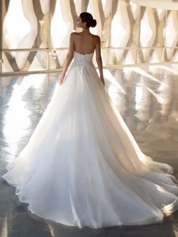 Romantické svatební šaty PARRISH vynikají korzetovým živůtkem bez ramínek, zdobeným bohatou krajkovou výšivkou s jemnými třpytivými detaily. Srdíčkový výstřih působí ženským a svůdným dojmem, zatímco slušivá áčková sukně z tylu dodává modelu královskou eleganci a lehkost. Zadní část šatů přechází do dlouhé vlečky, která se nádherně rozprostírá při chůzi. Ideální volba pro nevěstu, která touží po klasickém romantickém vzhledu.