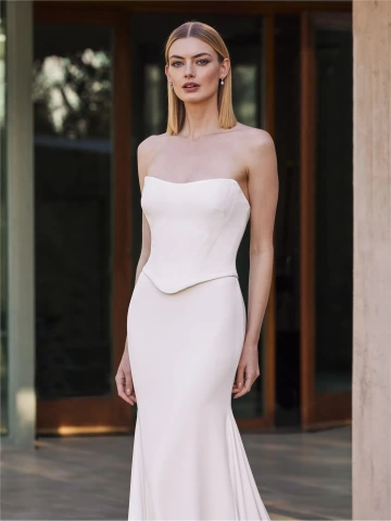 Minimalistická silueta, která podtrhuje krásu jednoduchosti. Svatební šaty POLENIA s čistými liniemi a odnímatelnými ramínky zaujmou moderním korzetovým živůtkem a elegantní sukní jemně kopírující postavu. Odhalená ramena dodávají modelu smyslnost, zatímco variabilita střihu umožňuje nevěstě měnit vzhled během dne – od rafinovaného „off-shoulder“ až po hladký, sofistikovaný korzet. Ideální volba pro nevěstu, která hledá šaty, jež v sobě spojují nadčasovou krásu a moderní šmrnc.