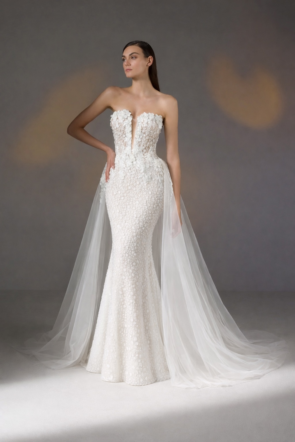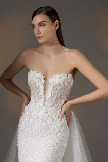 Zahalte se do lehkosti oslnivě třpytivých šatů Pronovias Privée AMYA z krajky s korálkově vyšívanými aplikacemi. Tyto svatební šaty ve střihu mořské panny mají živůtek bez ramínek se svůdným, hluboce vykrojeným výstřihem a přiléhavý pas. Šaty je možné dozdobit samostatnou připínací tylovou vlečkou.