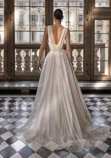 Sexy, nenucený a klasicky šik, tento inovativní design Pronovias Privée DOLOMITE v třpytivém tylu se svůdným rozparkem do půli stehna, poloiluzivním korzetovým živůtkem a úchvatným hluboko vykrojeným zadním dílem. Ušité z látky zdobené blyštivými glitry, které zachytí každý záblesk světla a zajistí, že ve svůj výjimečný den zazáříte jako hvězda. Tyto šaty Vás učiní středem pozornosti a zajistí, že budete při průchodu uličkou vyzařovat krásu a luxus.
