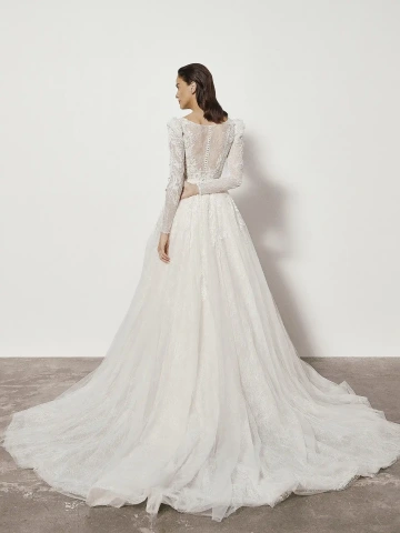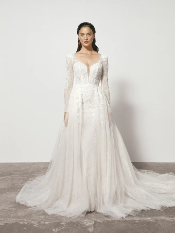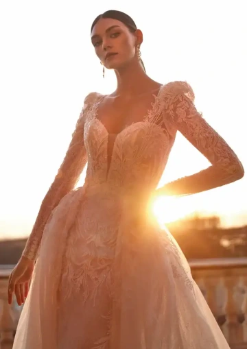 Model FIORA je ztělesněním sofistikované svatební elegance s jemným nádechem dramatičnosti. Přiléhavé šaty střihu fit & flare z luxusní krajky s jemným leskem se pyšní hlubokým výstřihem do tvaru srdce s transparentním tylem a dlouhými krajkovými rukávy. Bohatá výšivka s motivem listů a květů plynule přechází z živůtku po celé délce sukně a opticky prodlužuje siluetu.