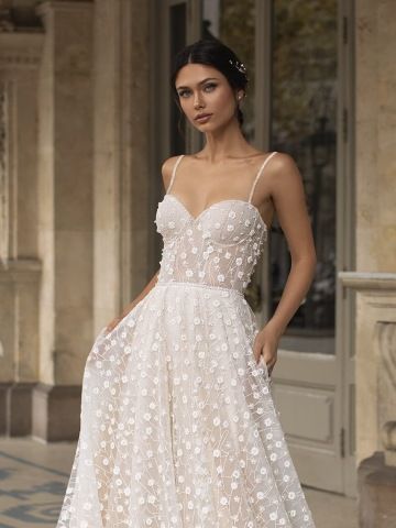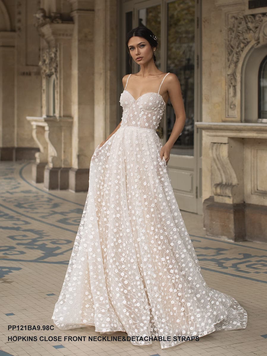 Zažijte glam eleganci s šaty HOPKINS, úchvatnými princeznovskými šaty na tenká ramínka z kolekce Pronovias Privée. Tyto úžasné šaty se srdíčkovým výstřihem krásně zdůrazňují dekolt a zároveň vyzařují sofistikovanost. Vypasovaný přiléhavý korzet s vynikající vnitřní strukturou pro dokonale tvarovaný výstřih i pas. Lichotivá áčková sukně z třpytivého tylu s krátkou vlečkou. Celé šaty odshora až dolů zdobí sofistikovaný vzor třpytivých květů, které ve tmě odrážejí světlo a díky tomu září.