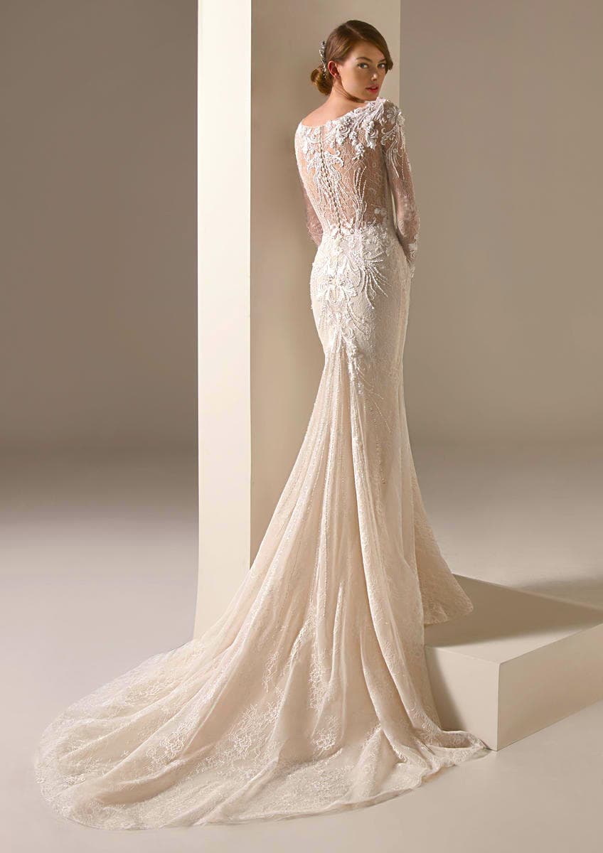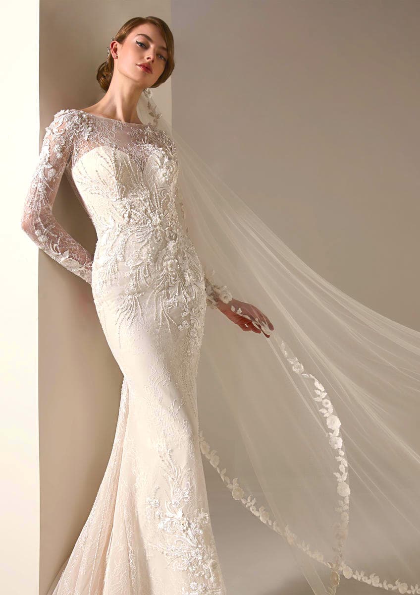 Model JACINDA je zosobněním luxusu, který nikdy nevyjde z módy. Střih siréna dokonale kopíruje ženské křivky, zatímco průhledný živůtek s dlouhými krajkovými rukávy vytváří jemný kontrast mezi romantikou a svůdností.