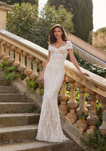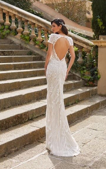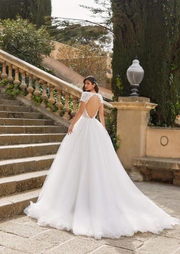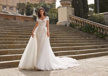 Svatební šaty JONNA jsou ztělesněním smyslnosti a elegance. Úzká silueta z luxusní vyšívané krajky se sofistikovaným vzorem nádherně obepíná postavu, zatímco hluboký výstřih na zádech dodává odvážný, ale stále něžný nádech. Bohatě zdobený živůtek přechází do úzké sukně, kterou lze proměnit připevnitelnou tylovou overskirt v okouzlující princeznovský look. Tyto šaty jsou ideální volbou pro nevěstu, která hledá jedinečnou kombinaci glamour a romantiky v jednom modelu.