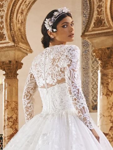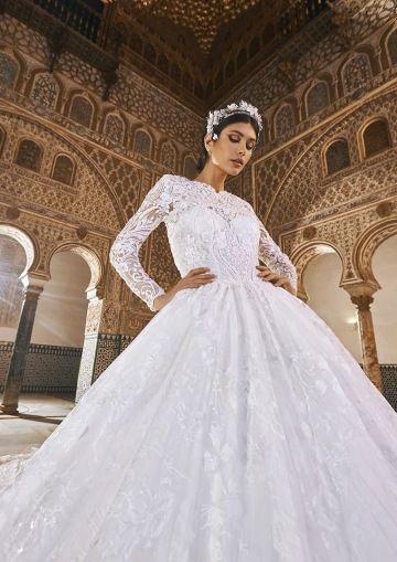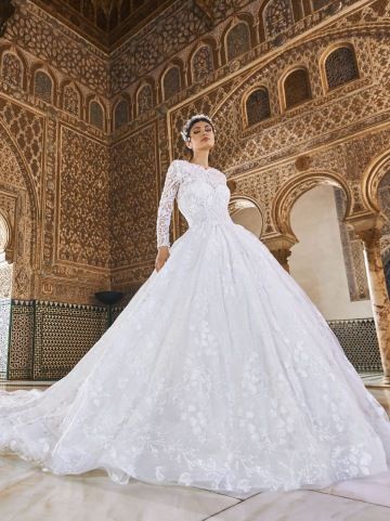 NATRUN z kolekce Pronovias Privée jsou majestátní svatební šaty pro nevěstu, která sní o královském vzhledu. Bohatá princeznovská sukně je zdobena krajkou s výrazným květinovým vzorem, který se jemně leskne při každém pohybu. Korzetový živůtek hustě zdobený korálky se srdcovým výstřihem nádherně tvaruje postavu a v kombinaci s krajkovým bolerkem s dlouhými rukávy dodává šatům sofistikovaný, až královsky slavnostní nádech.