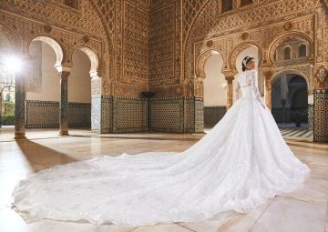 Imponující velmi dlouhá vlečka dokončuje celkový dojem a činí z těchto šatů nezapomenutelný klenot každé svatby.