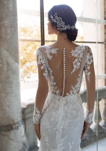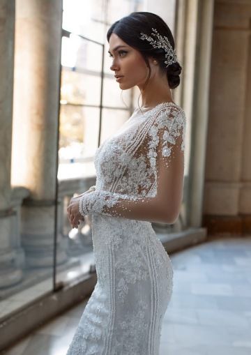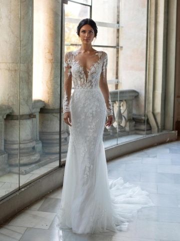 Představujeme šaty PICKFORD, úchvatný haute couture model z kolekce Pronovias Privée. Tyto okouzlující šaty střihu mořské panny se vyznačují transparentním illusion živůtkem dlouhými průhlednými rukávy, každý z nich zdobený nádhernými aplikacemi a třpytivými flitry, které odrážejí světlo při každém pohybu. Tento model nabízí moderní a zároveň nadčasovou estetiku, ideální pro moderní nevěstu, která chce ve svůj výjimečný den udělat dojem.