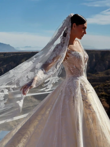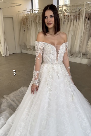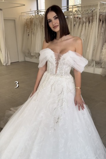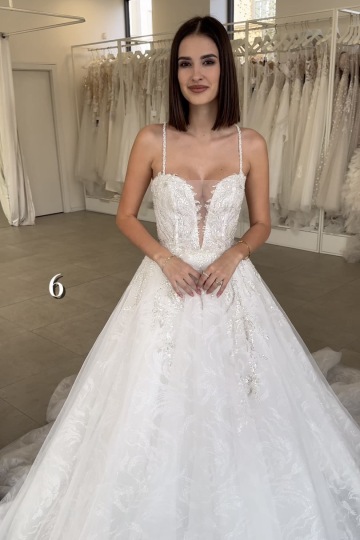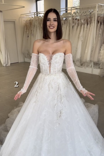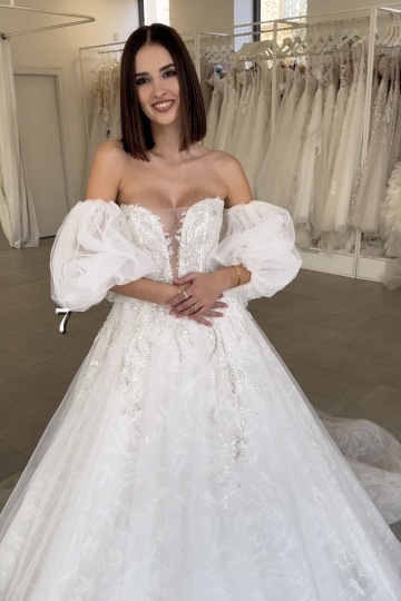 Odnímatelná ramínka s rukávy je možné nosit také spadená z ramen, což dodá tomuto modelu nádech romantiky a elegance. Tyto šaty Vás učiní středem pozornosti a zajistí, že budete při průchodu uličkou vyzařovat krásu a luxus.