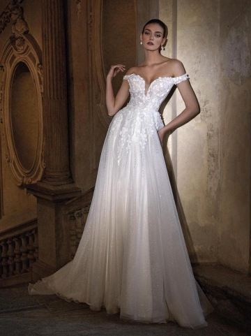 Propracované princeznovské svatební šaty Pronovias Privée TURMALIN s lichotivou áčkovou sukní z třpytivého tylu. Proplujte uličkou v této oslnivé róbě se srdíčkovým výtřihem a něžnými spadenými ramínky, které je možné odepnout. Vypasovaný přiléhavý živůtek s vynikající vnitřní strukturou pro dokonale tvarovaný dekolt i pas.