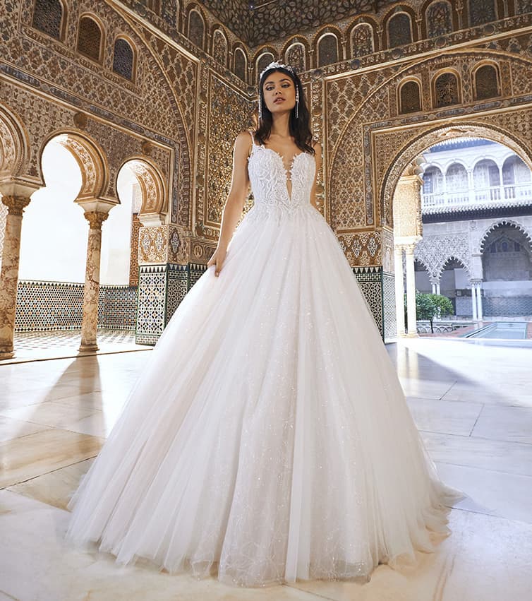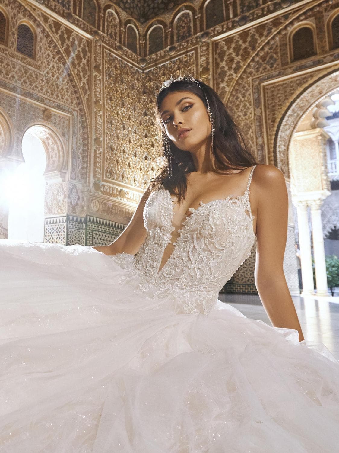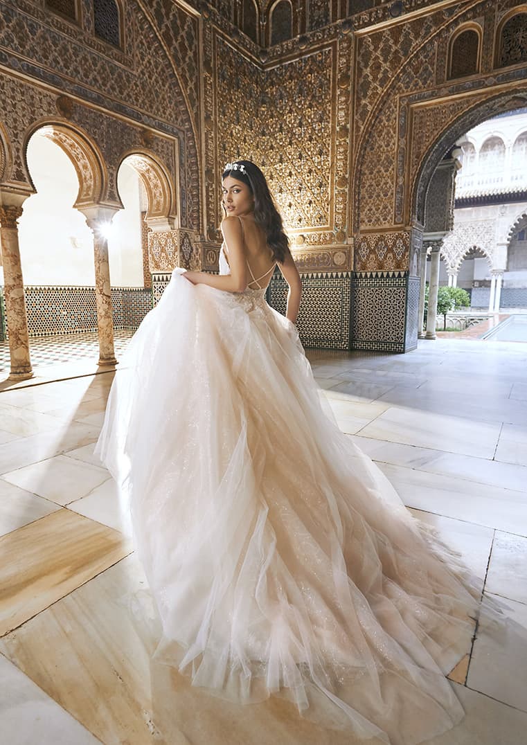 Šaty UMALMA okouzlí nevěsty, které touží po pohádkovém vzhledu s moderním nádechem. Bohatá princeznovská sukně z několika vrstev třpytivého tylu se nádherně vlní při každém kroku. Korzetový živůtek s hlubokým výstřihem do tvaru srdce zdobí jemné krajkové aplikace s perličkami a flitry, které plynule přecházejí do pasu. Tenká ramínka a smyslný odhalený zadní díl dodávají modelu lehkost a ženskost. Ideální volba pro nevěstu, která chce zazářit v záplavě luxusu a elegance.