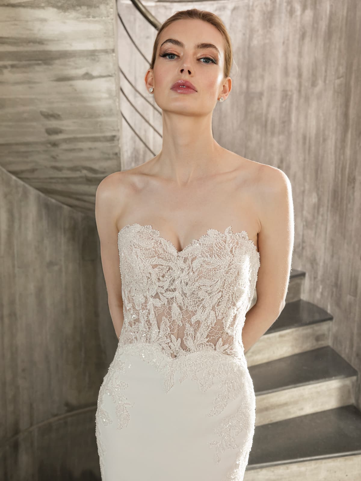 Osvojte si kouzlo sofistikovanosti s těmito podmanivými šaty ve stylu mořské panny. Svatební šaty PYCE od Pronovias vyzařují zdánlivou jednoduchost. Korzet má elegantní srdíčkový výstřih bez ramínek se pyšní luxusní vyšívanou krajkou s flitry, která vytváří fascinující souhru textur a třpytek. Krajka jemně splývá s vaší siluetou a sbíhá dolů na vlečku, kde dodává celkovému vzhledu prvek romantiky a wow efektu. Díky své decentní eleganci a propracovaným detailům slibují šaty PYCE zanechat trvalý dojem ve váš výjimečný den.