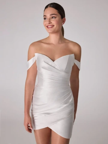 Sklady a objem se spojují a vytvářejí jedinečný model. QUINN jsou mini šaty z mikáda se strukturovaným designem, výstřihem s odhalenými rameny a skládanými detaily, které lichotí postavě. Nafouklé odnímatelné rukávy zároveň dodávají překvapivý a sofistikovaný vzhled.
