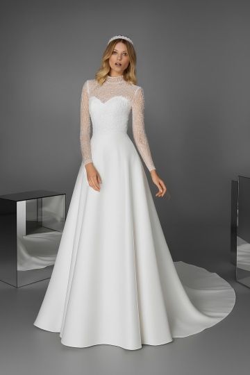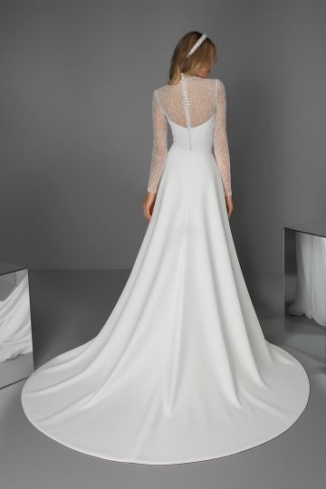 Šaty REVERIE působí královsky a nadčasově. Hladká sukně v linii A z lehkého mikada nádherně splývá a vytváří elegantní siluetu s decentní vlečkou. Živůtek se srdíčkovým korzetem je překrytý tylem vyšívaným jemnými korálky se stojáčkem, který pokračuje do dlouhých rukávů. Průsvitná záda s drobnými knoflíčky dodávají modelu půvab i rafinovanost. Ideální volba pro nevěstu, která hledá spojení klasické čistoty a moderního detailu.
