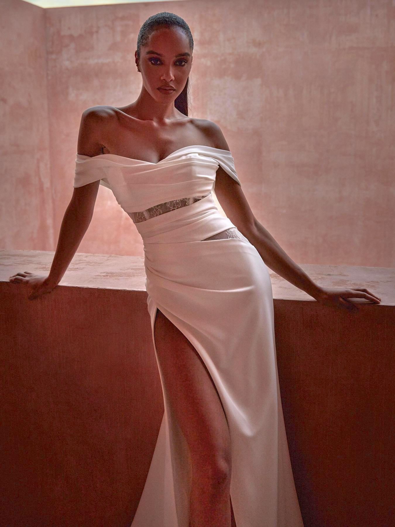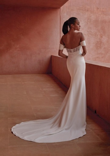 Úzká sukně z luxusního splývavého krepu je doplněna vysokým rozparkem, jenž podtrhuje délku nohou a dodává šatům výrazný fashion charakter. Čisté linie, práce s vrstvením a rafinované detaily dělají ze SUNJ ideální volbu pro nevěsty, které hledají moderní, sebevědomý a vysoce elegantní couture model s důrazem na siluetu a detail.