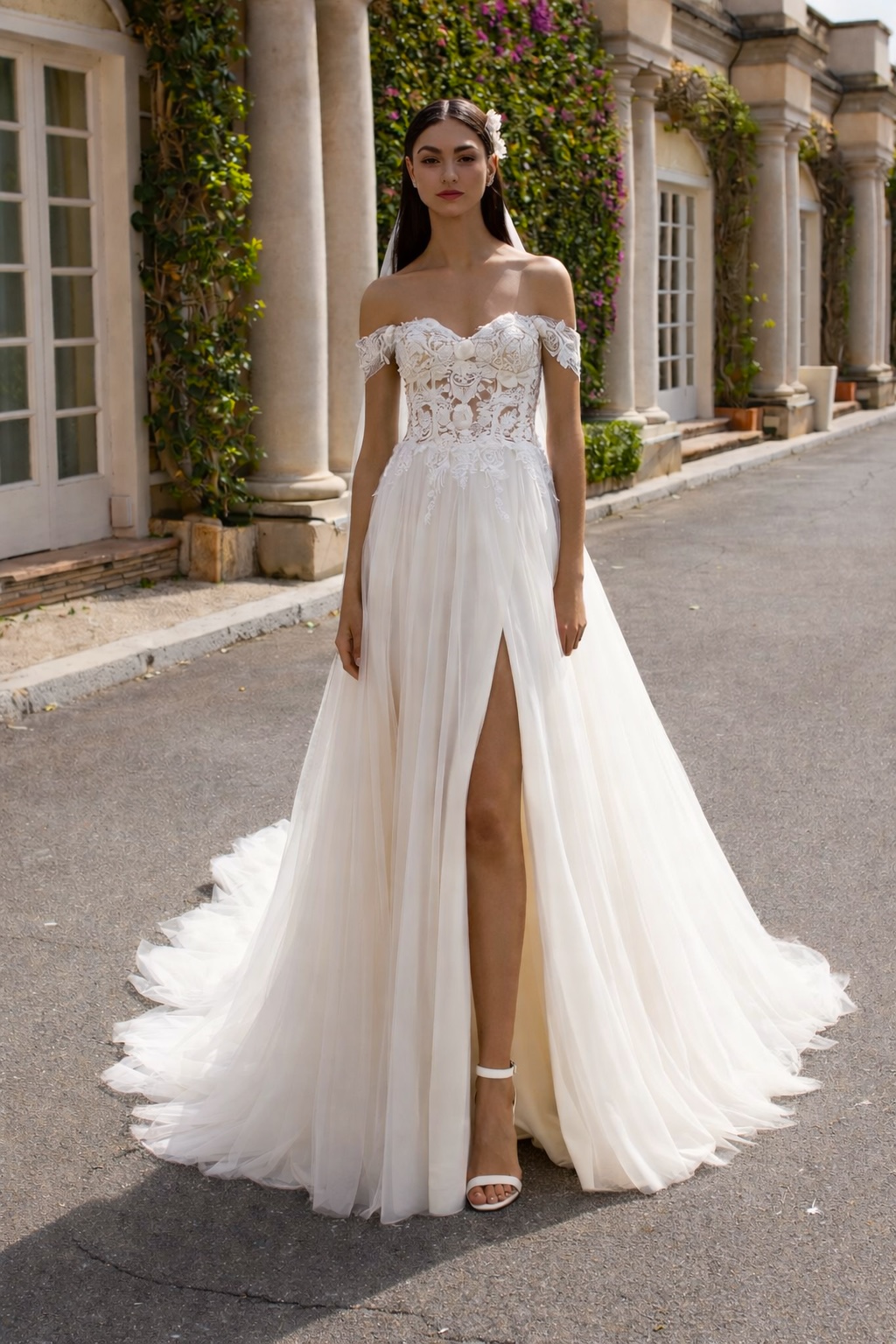 Vzdušná tylová sukně s rozparkem se měkce rozlévá do délky a při chůzi vytváří lehký, éterický pohyb. Díky kontrastu jemné sukně a strukturovaného korzetu působí šaty velmi vyváženě – romanticky, ale zároveň moderně. UMBRIEL je ideální volbou pro nevěstu, která chce vypadat něžně a žensky, ale zároveň si přeje model s výrazným charakterem a nezaměnitelnými detaily.