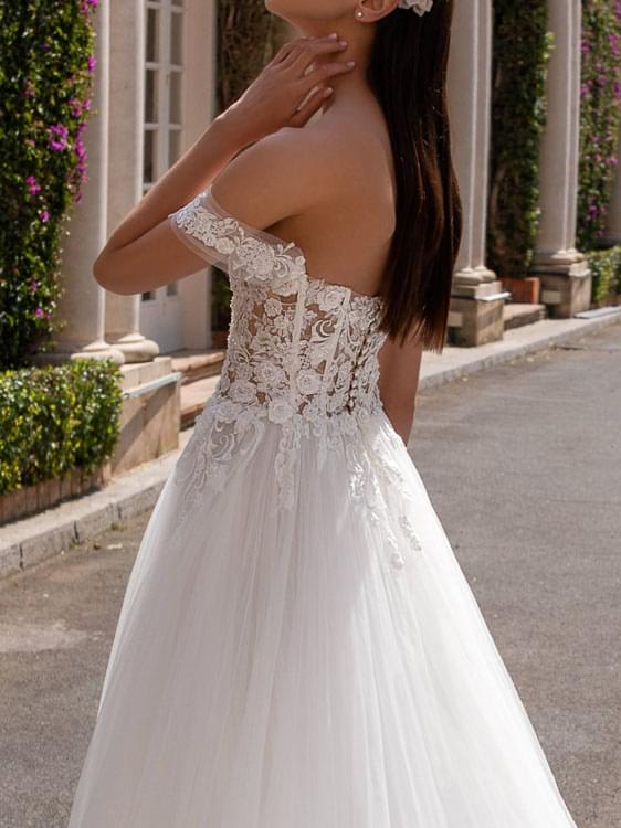 Šaty UMBRIEL působí jako jemná kombinace romantiky a smyslné elegance. Korzet s bohatou krajkovou výšivkou je částečně transparentní a nechává vyniknout precizní práci s motivy, které plynule navazují ze živůtku do sukně. Odhalená ramena s krajkovými spadlými rukávky dodávají modelu lehce bohémský nádech, zatímco hlubší tvarování korzetu krásně zvýrazňuje dekolt i pas.