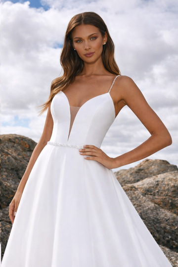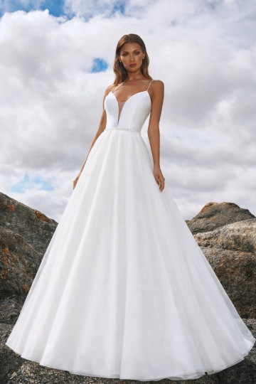 Hladké svatební šaty VALENSOLE na tenká ramínka s áčkovou organzovou sukní a trendovým hlubokým výstřihem až do pasu. Velmi rafinované, precizně vypracované šaty doplněné jemným kamínkovým páskem a ozdobnými ramínky se Swarovski Elements. Velice elegantní, nadčasové a zároveň sexy. Skvěle padnoucí střih živůtku zdůrazňuje prsa a pas.