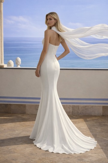 K šatům je možné doplnit dlouhý šifonový šál splývající kolem krku a volně vlající za zády, který dodává modelu pohyb, lehkost a dramatický couture akcent. Minimalismus zde působí sebevědomě, luxusně a nadčasově.
