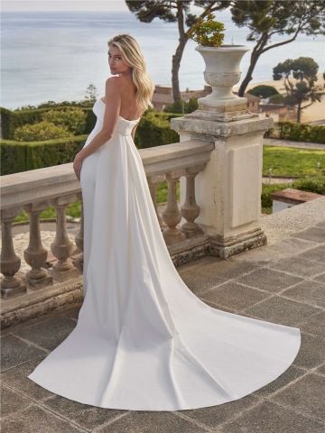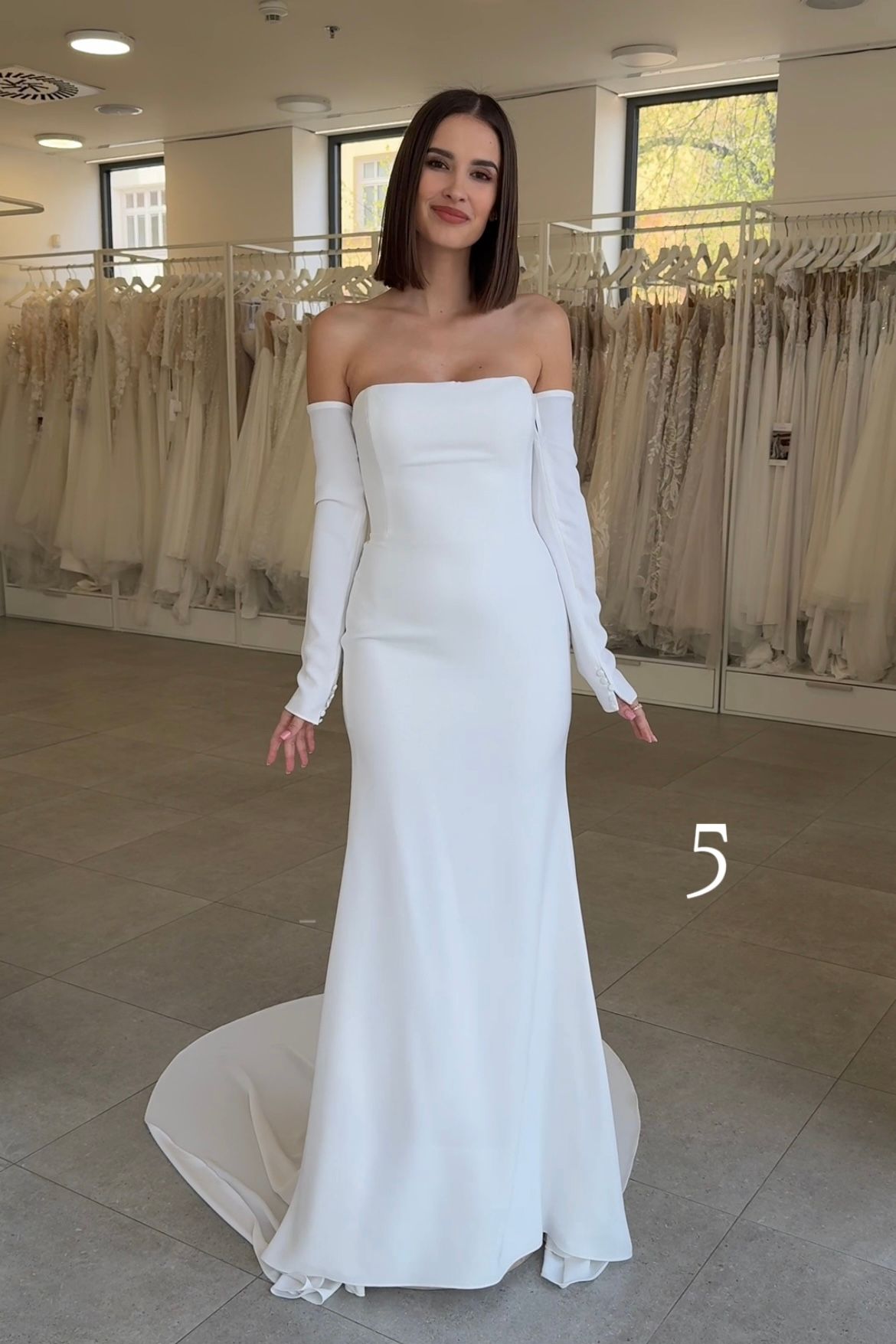 Svatební šaty YUVAL jsou dokonalým ztělesněním moderní čistoty a couture minimalismu. Hladká silueta bez ramínek se vyznačuje architektonickým detailem v podobě originálně přeloženého lemu, který nahrazuje výstřih a elegantně rámuje dekolt. Luxusní pružný krep zajišťuje dokonalé pohodlí, zatímco dlouhá připínací vlečka dodává modelu slavnostní noblesu.