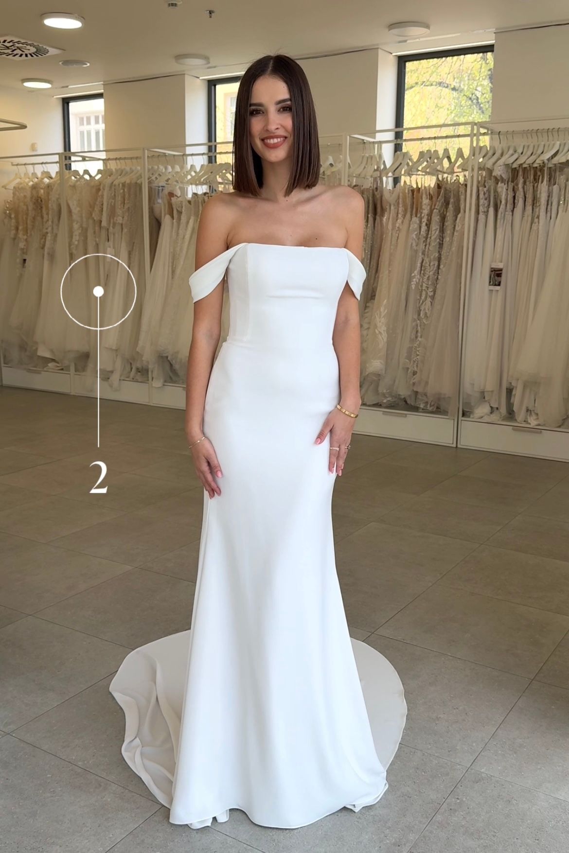 Tyto šaty jsou ideální pro nevěstu, která ocení precizní střih, dokonalou jednoduchost a sílu ticha — tam, kde krása nepotřebuje žádné ozdoby.